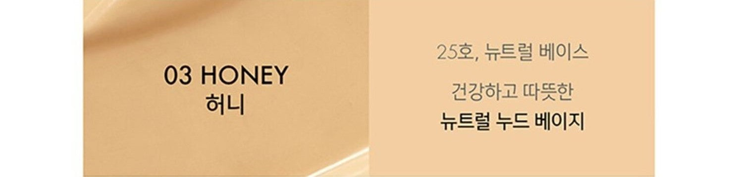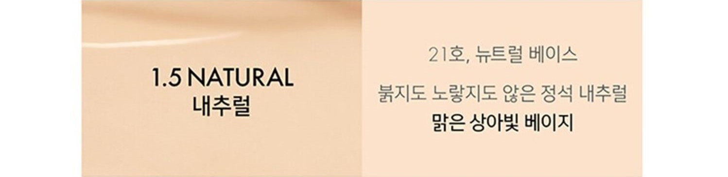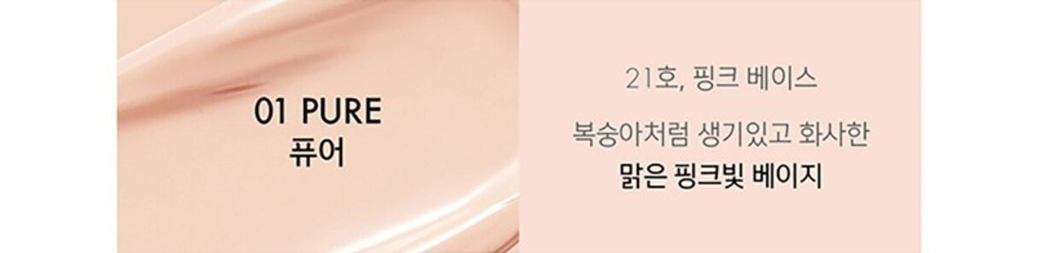 Vegan cushion is enriched with 60% essence to nourish skin while offering natural-looking coverage with a dewy finish. It contains cica extract to soothe skin and eight types of peptide to improve skin elasticity. Water mint extract in the mix offers a cooling effect. Fitted with SPF50 PA++++ to provide sun protection.