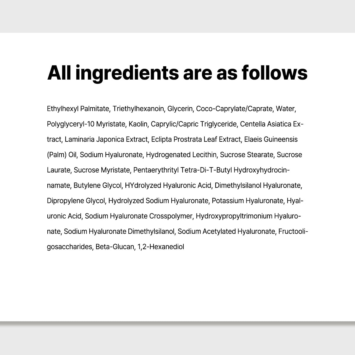 Ethylhexyl Palmitate, Triethylhexanoin, Glycerin, Coco-Caprylate/Caprate, Water, Polyglyceryl-10 Myristate, Kaolin, Caprylic/Capric Triglyceride, Centella Asiatica Ex-tract, Laminaria Japonica Extract, Eclipta Prostrata Leaf Extract, Elaeis Guineensis (Palm) Oil, Sodium Hyaluronate, Hydrogenated Lecithin, Sucrose Stearate, Sucrose Laurate, Sucrose Myristate, Pentaerythrityl Tetra-Di-T-Butyl Hydroxyhydrocin-namate, Butylene Glycol, Hydrolyzed Hyaluronic Acid, Dimethylsilanol Hyaluronate, Dipropylene Glycol, Hydrolyzed Sodium Hyaluronate, Potassium Hyaluronate, Hyal-uronic Acid, Sodium Hyaluronate Crosspolymer, Hydroxypropyltrimonium Hyaluro-nate, Sodium Hyaluronate Dimethylsilanol, Sodium Acetylated Hyaluronate, Fructooli-gosaccharides, Beta-Glucan, 1,2-Hexanediol.