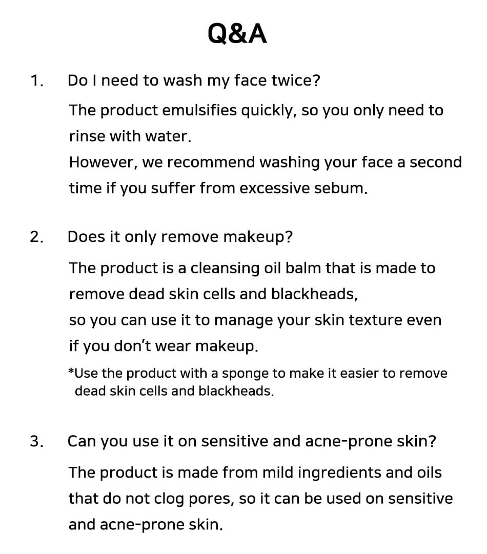 Use an appropriate amount on dry face. Gently massage to remove makeup. Wet face to emulsify cleanser to remove sebum and dead skins. Rinse off with lukewarm water.