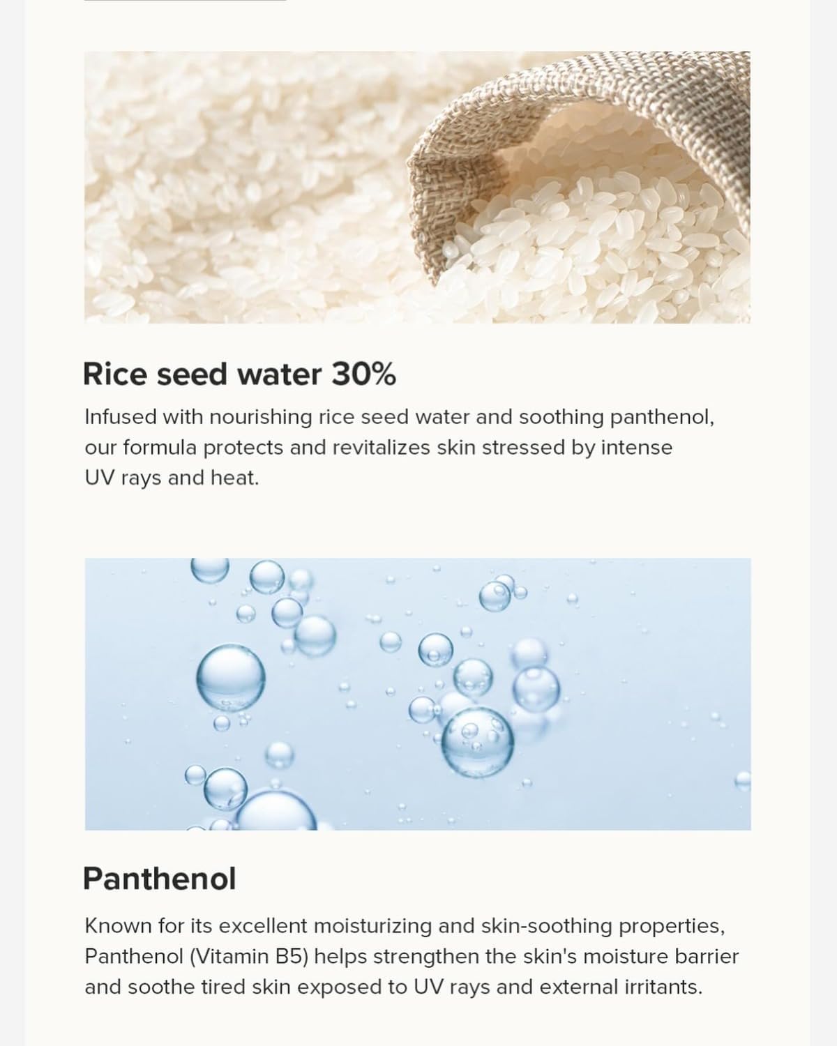 Water, Oryza Sativa (Rice) Seed Water, Dibutyl Adipate, Butyloctyl Salicylate, Ethylhexyl Triazone, Drometrizole Trisiloxane, Polyglyceryl-3 Distearate, Terephthalylidene Dicamphor Sulfonic Acid, Diethylamino Hydroxybenzoyl Hexyl Benzoate, Polymethylsilsesquioxane, Tromethamine, 1,2-Hexanediol, Panthenol, Pentylene Glycol, Glyceryl Stearate, Silica, Caprylyl Methicone, Bis-Ethylhexyloxyphenol Methoxyphenyl Triazine, Propanediol, Potassium Cetyl Phosphate, Poly C10-30 Alkyl Acrylate, Methylpropanediol, Carbomer, Acrylates/C10-30 Alkyl Acrylate Crosspolymer, Ethylhexylglycerin, Xanthan Gum, Glycerin, Polyether-1, Avena Sativa (Oat) Kernel Extract, Cynara Scolymus (Artichoke) Leaf Extract, Polyquaternium-51, Camellia Sinensis Leaf Water, Hydrogenated Lecithin, Beta-Glucan, Biosaccharide Gum-1, Inositol, Tocopherol, Ferulic Acid, Oryza Sativa (Rice) Bran Oil, Citric Acid, Ceramide NP, Phytosphingosine, Sodium Hyaluronate, Rice Amino Acids, Rice sh-Oligopeptide-1