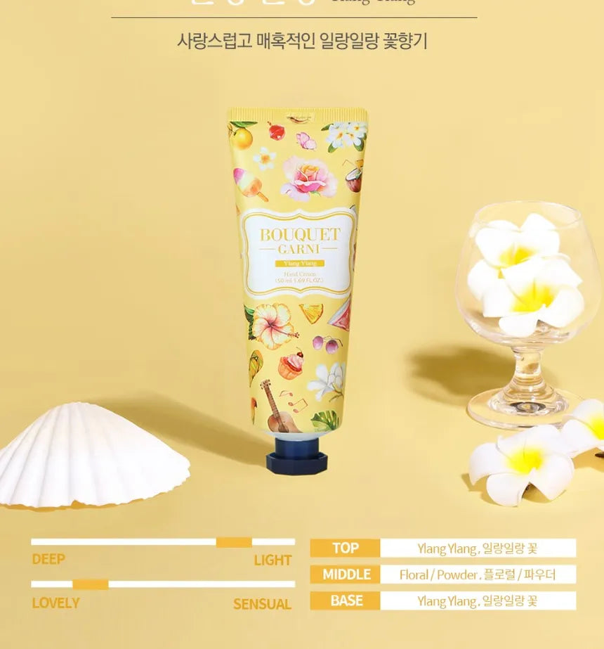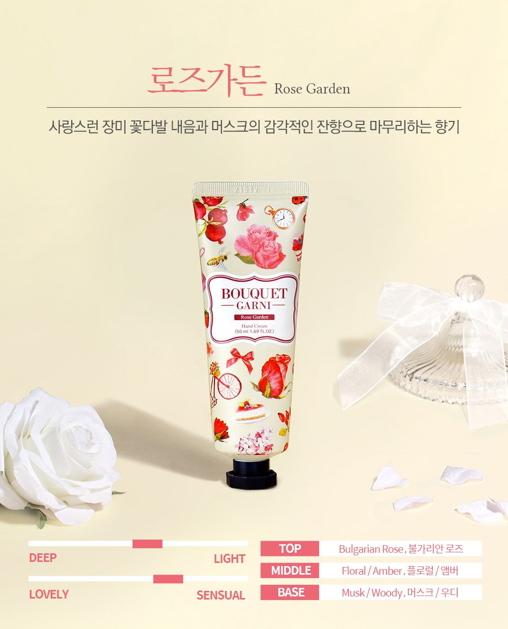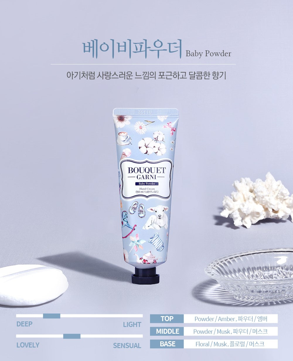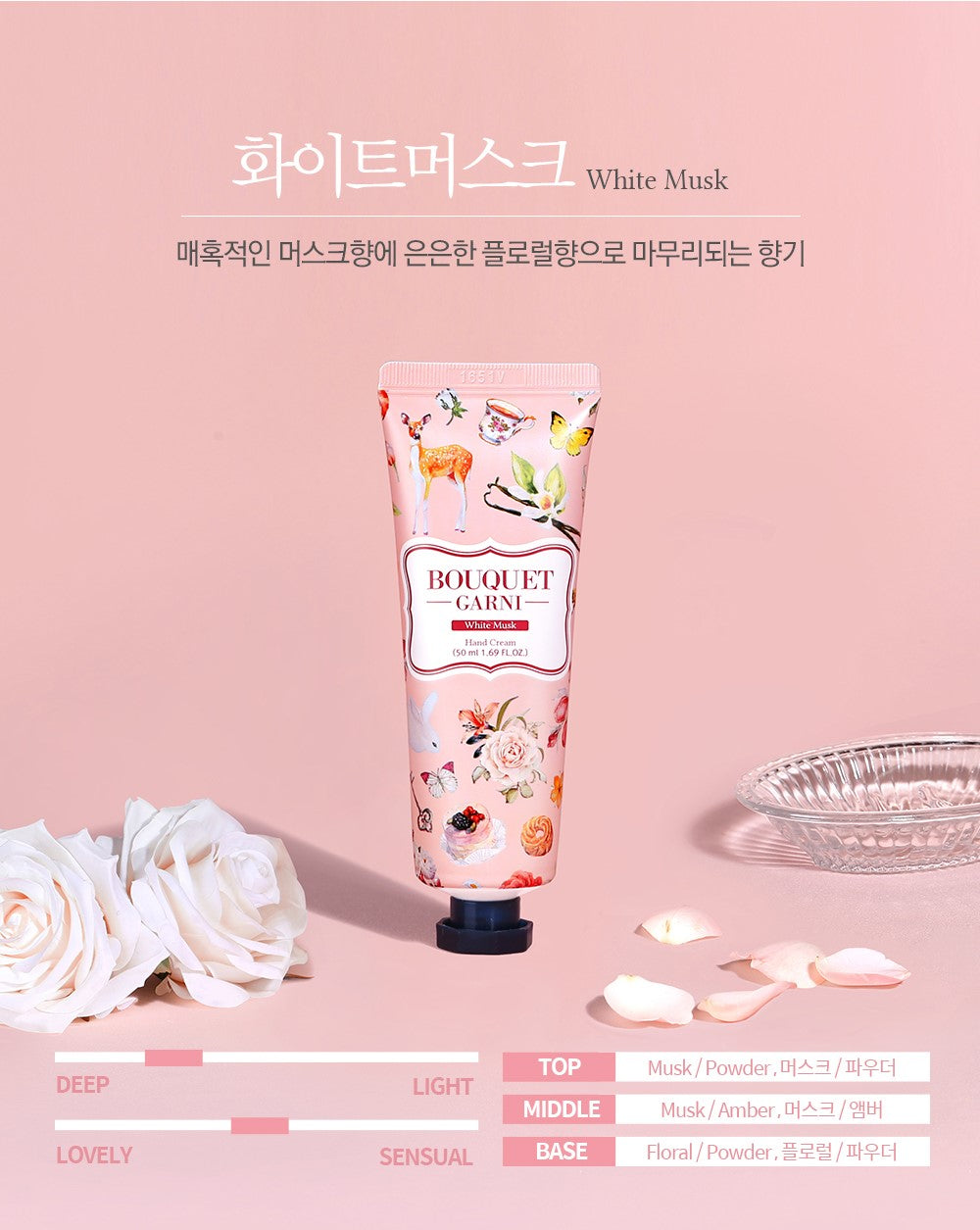 - A hypoallergenic hand cream with 7 types of fragrance: White Musk, Clean Soap, Cherry Blossom, Lovely Rose, Baby Powder, Rose Garden, Ylang Ylang.