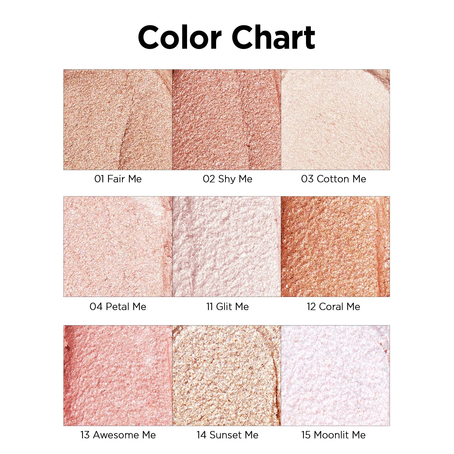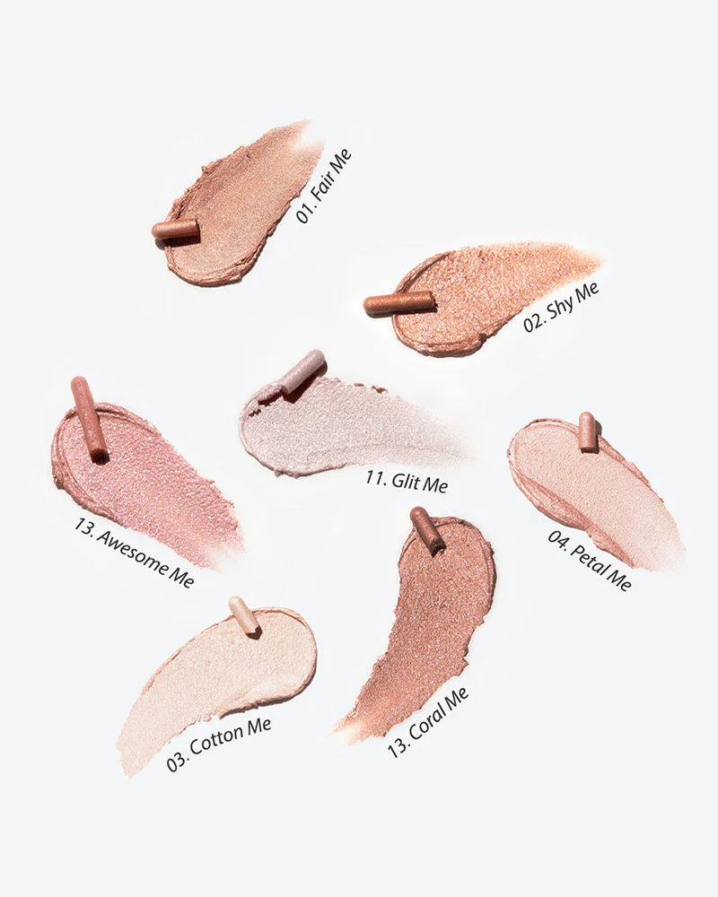 Trimethylsiloxysilicate, Lauroyl Lysine, Titanium Dioxide (CI 77891), Octyldodecanol, Synthetic Wax, Ceresin, Iron Oxide Red (CI 77491), Euphorbia Cerifera (Candelilla) Wax, Disteardimonium Hectorite, Dimethicone Crosspolymer, Propylene Carbonate, Tin Oxide, Rosa Canina Fruit Oil, [#14 Sunset Me]: Cyclopentasiloxane, Silica, [#15 Moonlit Me]: Cyclopentasiloxane, Cyclopentasiloxane, Calcium Titanium Borosilicate, Polyethylene, Synthetic Fluorphlogopite, [#04 Petal Me]: Cyclopentasiloxane, Mica (CI 77019), Iron Oxide Black (CI 77499), Calcium Sodium Borosilicate, Calcium Aluminum Borosilicate, Mica(CI 77019), Carmine (CI 75470), Triethoxycaprylylsilane