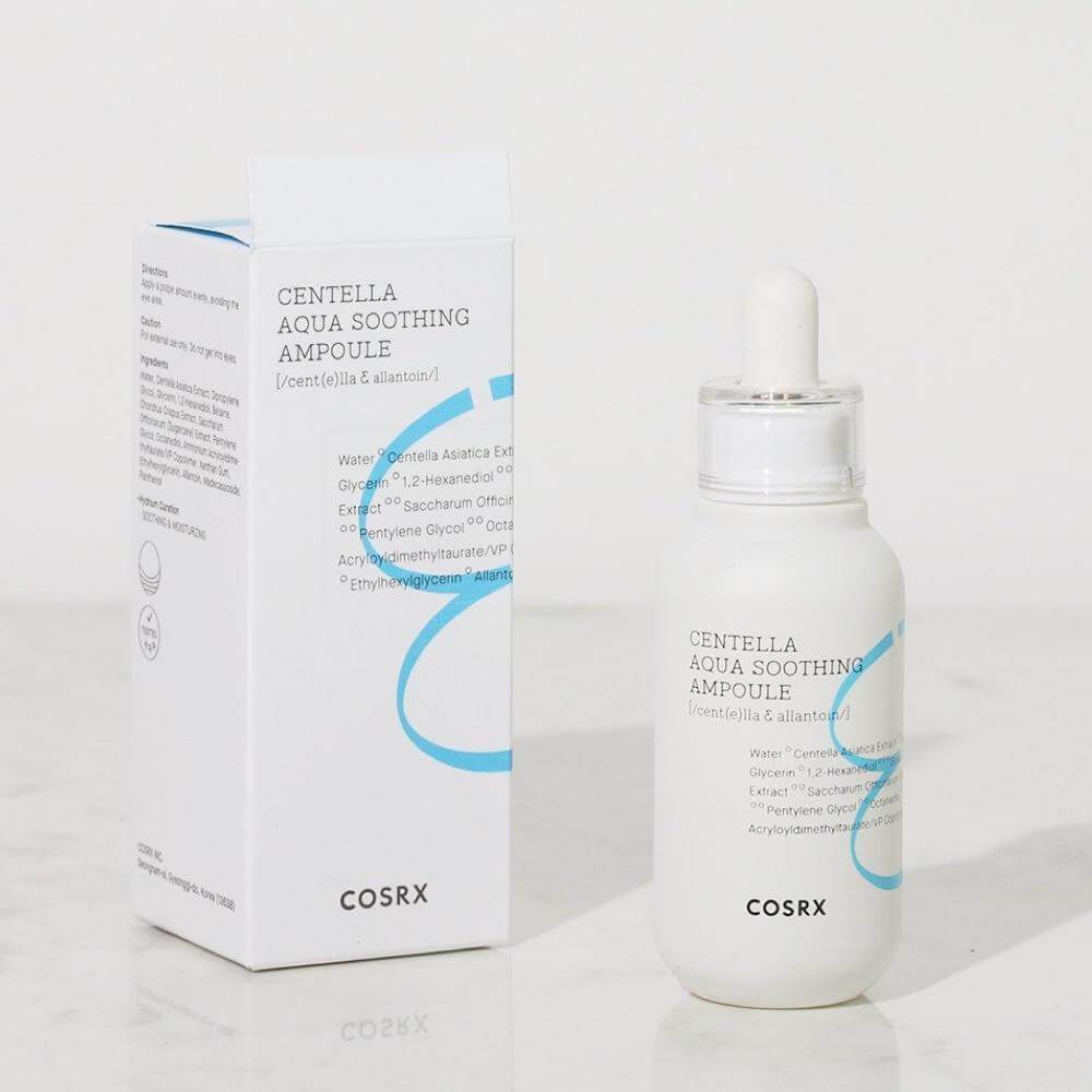 COSRX AC Collection Blemish Spot Clearing Serum is used when you want to remove scars or marks left after the trouble is gone, and Hydrium Centella Aqua Soothing Ampoule can be used for active acne which requires moisturizing without irritation.