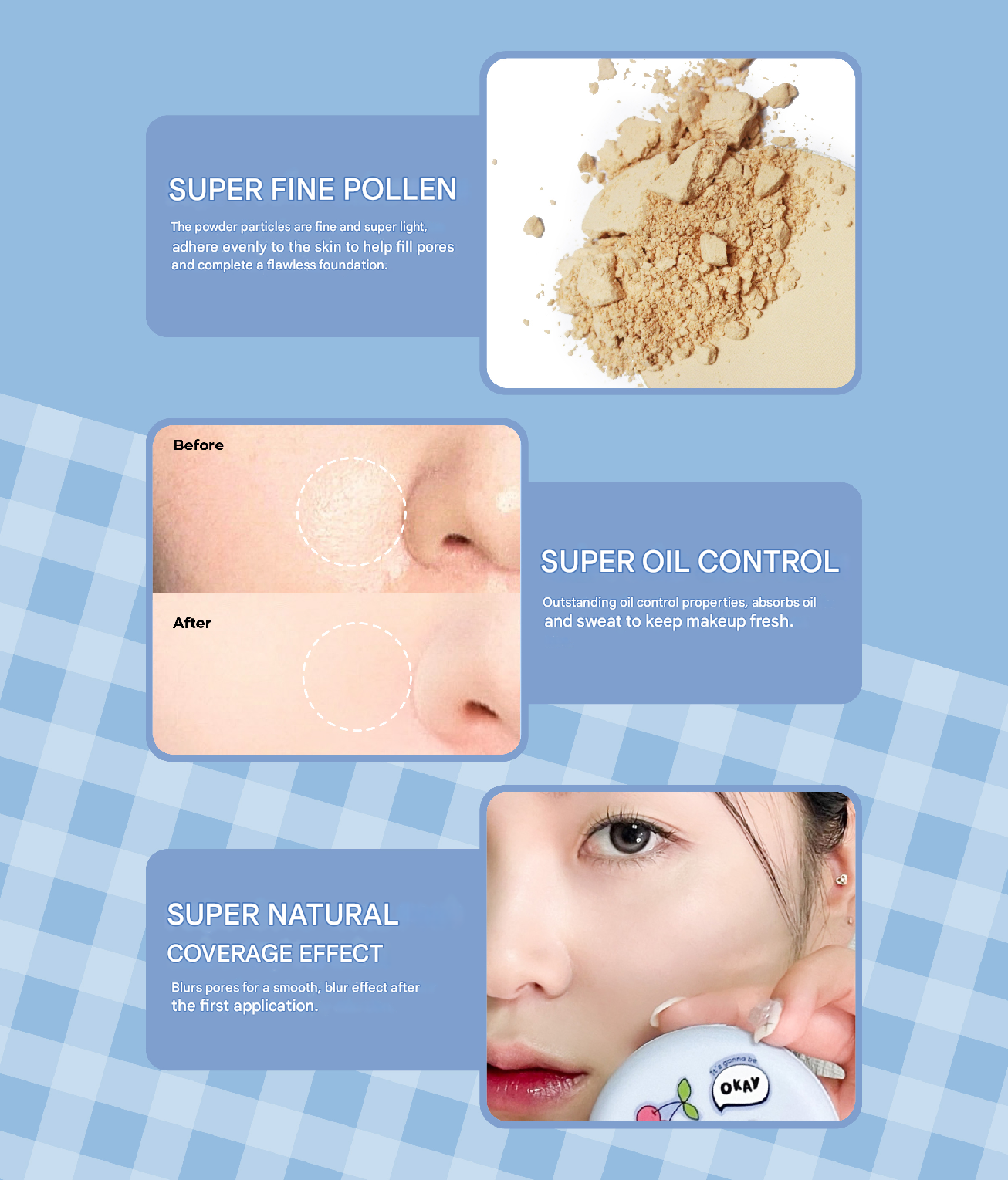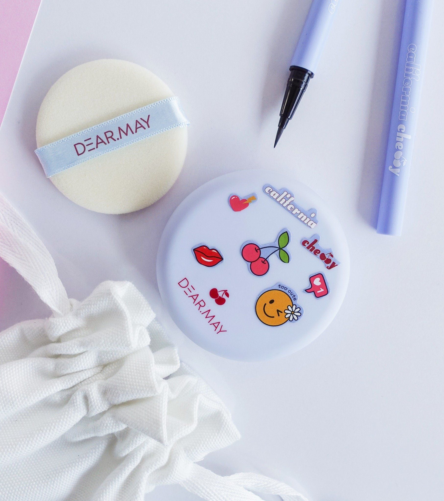 Dear May California Cherry Sebum Pact create flawless "fluffy" skin that looks like it has been blurred, it is so cute made with trendy stickers my own facts. It made with micro power that can control sebum and sweat that gives blur effect.
