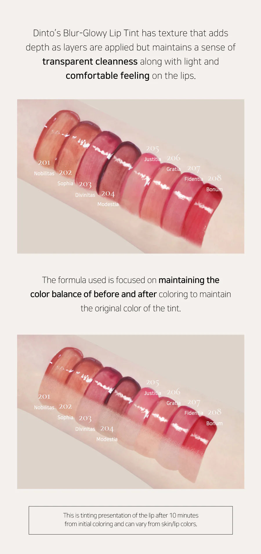 Dinto's Blur-Glowy Lip Tint is designed to present a most pleasant amount of moisture on the lips to express a glossy effect with the absence of stickiness.