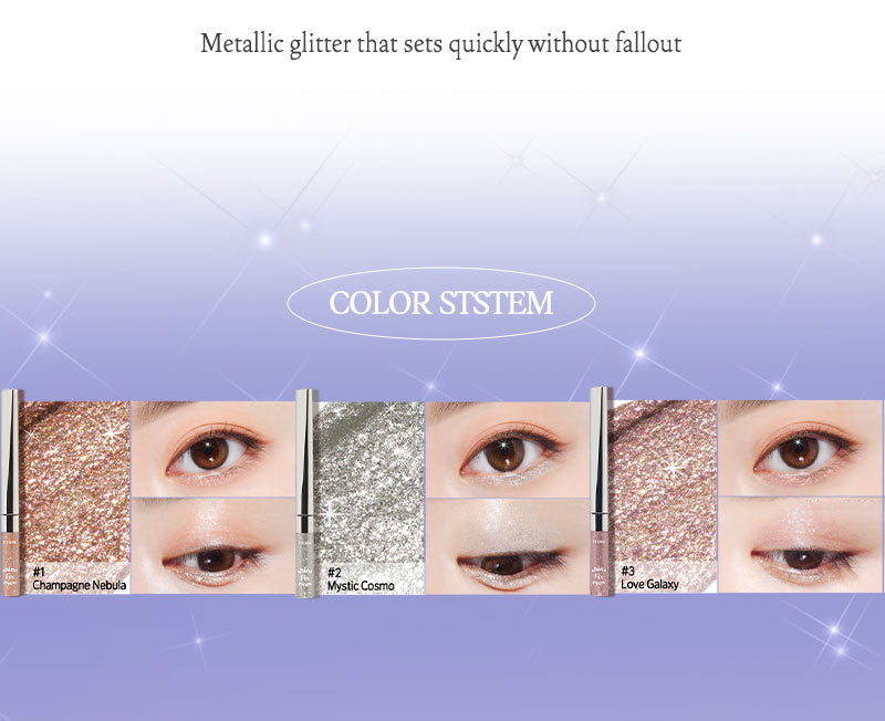 Add sparkles to your eye makeup with this liquid eye glitter. Its specially designed brush applicator enables easy and precise application of glitters onto desired areas. The water-based texture adheres seamlessly on the eyelid without caking. Available in #01 Champagne Nabula (silver and gold glitters in a champagne base color), #02 Mystic Cosmo (opal glitters in a silver base color) and #03 Love Galaxy (pink pearl glitters in a gold base color).