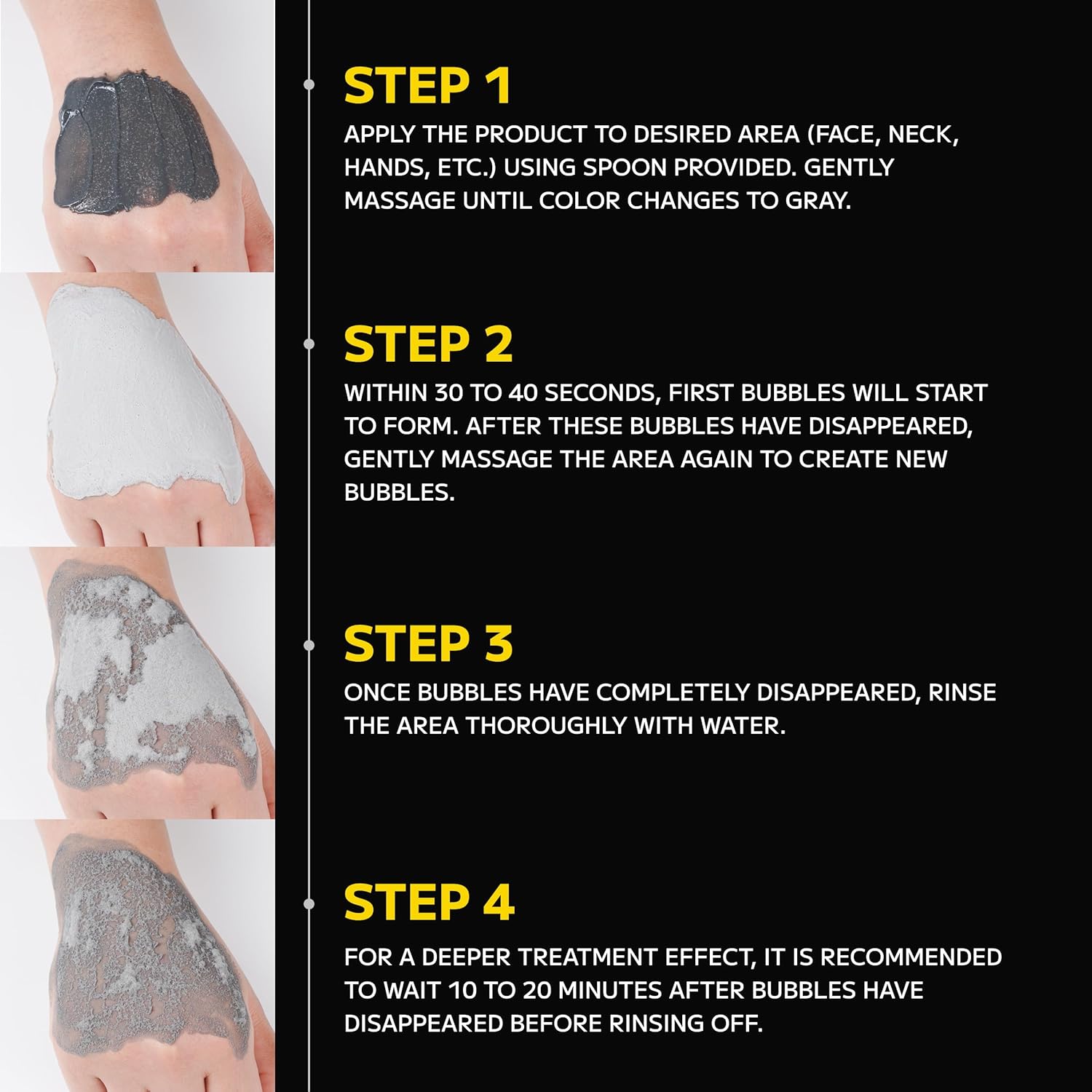 Apply the pack using the enclosed spoon, spreading it evenly over the desired area until the color changes to gray. After 30 to 40 seconds, bubbles will begin to form. Massage gently until the bubbles disappear, then rinse thoroughly with water. For deeper cleansing effects, leave the pack on for 10 to 20 minutes after the bubbles disappear before rinsing off.