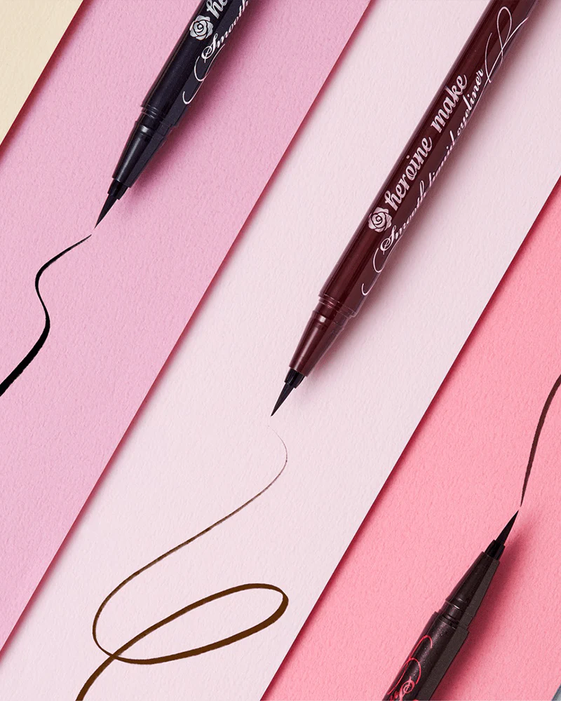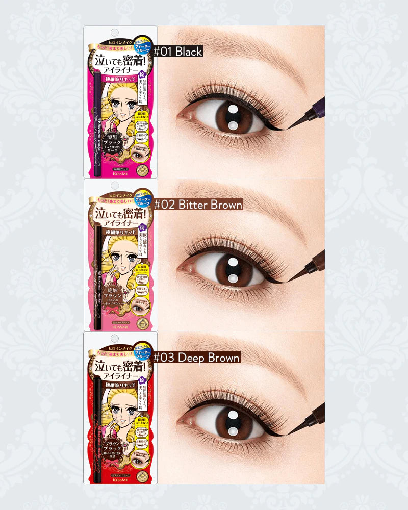 KISSME's Heroine Make Smooth Liquid Eyeliner Super Keep adheres tightly under even a rainstorm. A strong, long-lasting Japanese eyeliner product with vivid pigmentation in 3 dark colours.