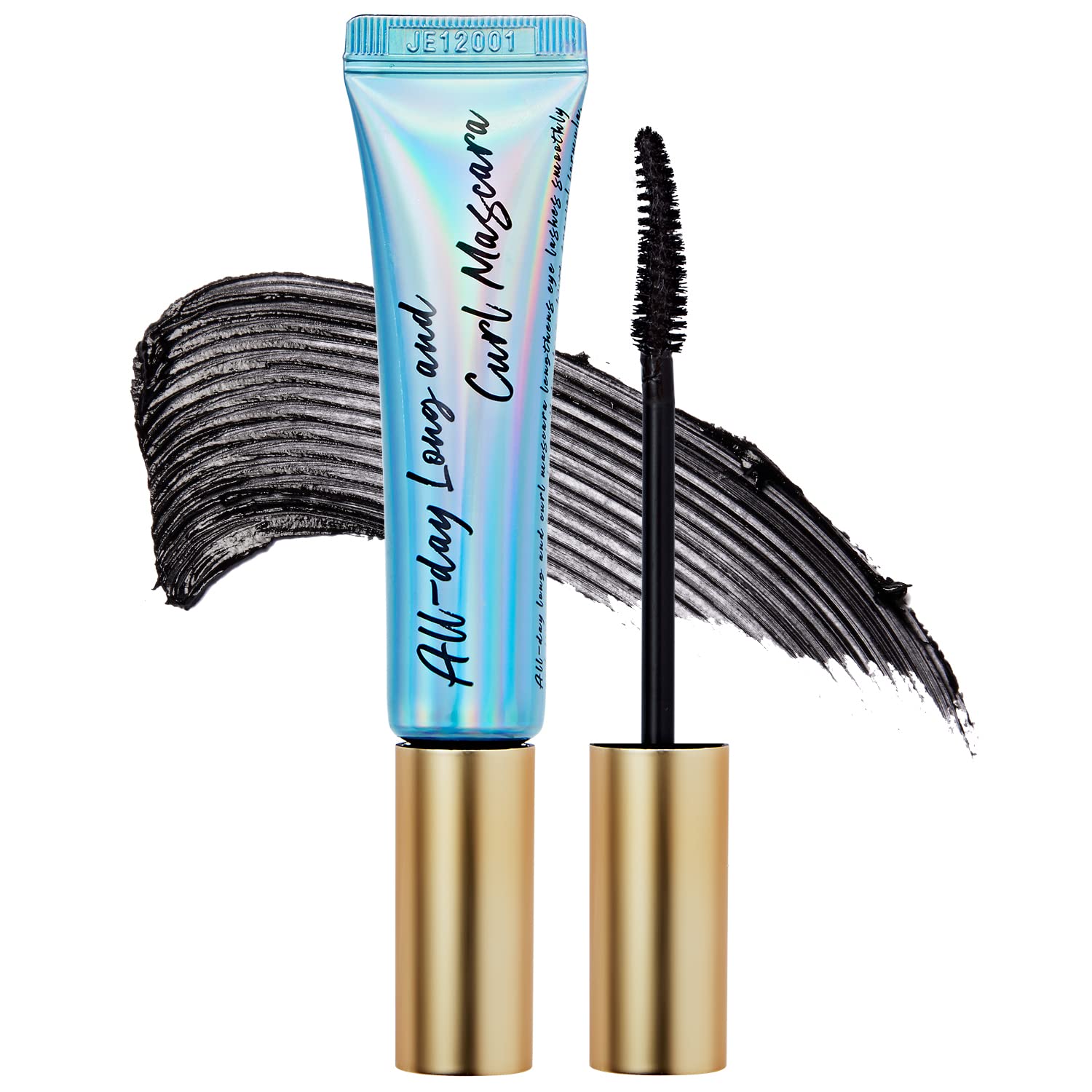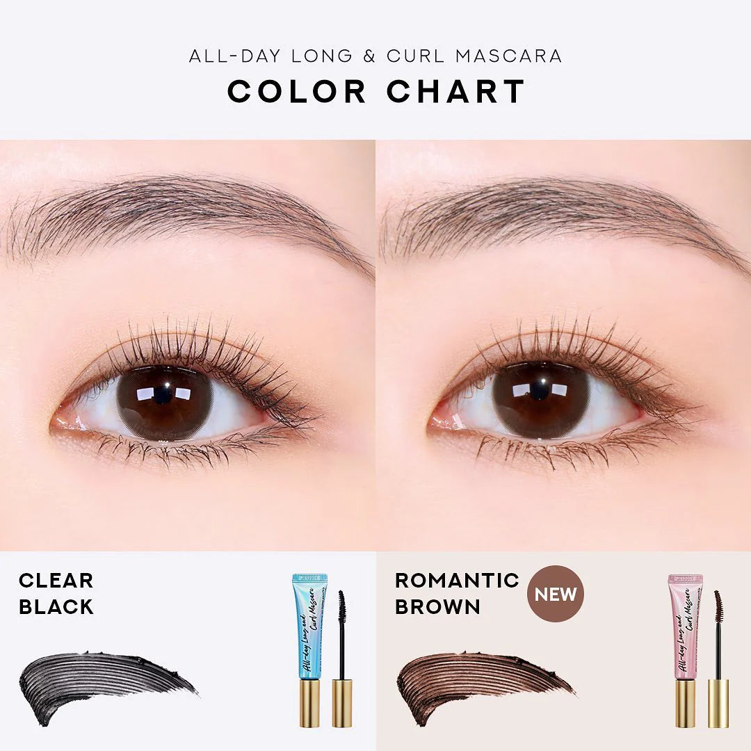 Create a doll-eye lash effect with this All Day Long And Curl Mascara. It features a C-curve brush and a formula packed with micro fibers and high-adherence wax for precise application to lengthen and curl lashes.