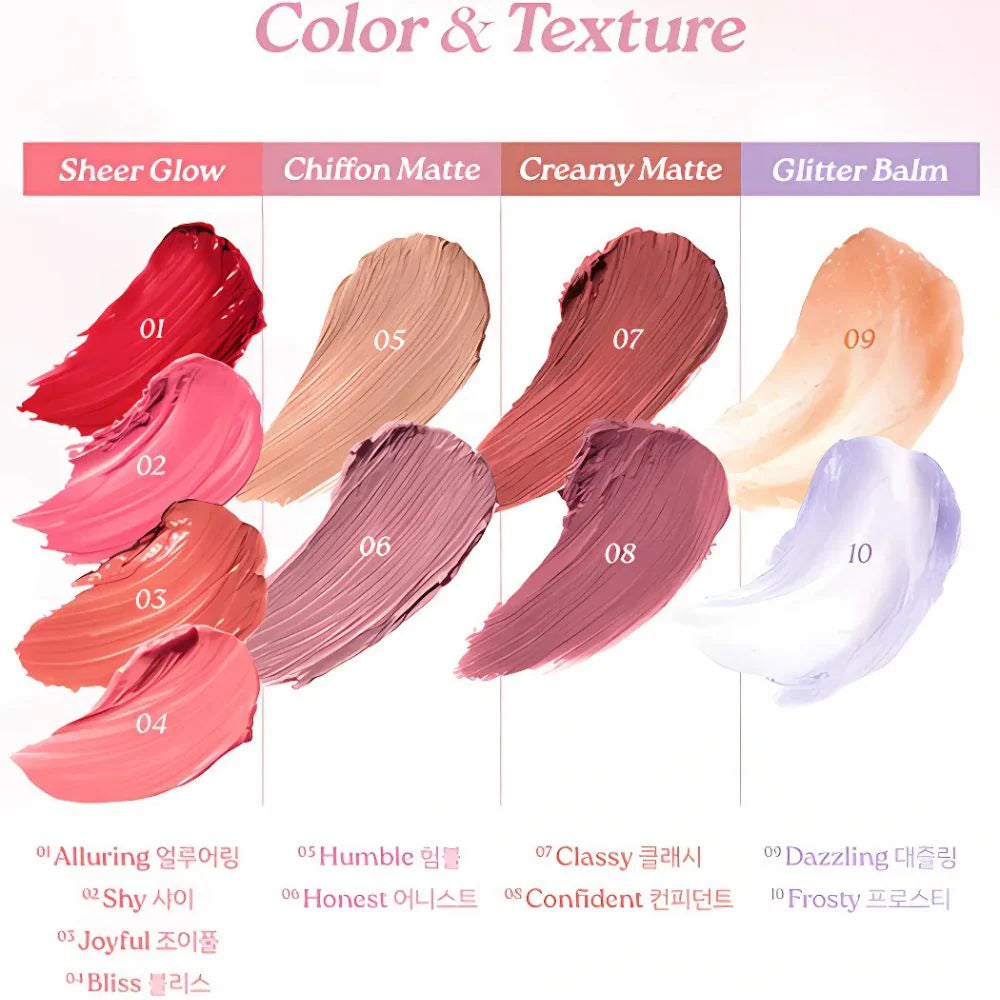 - Features 4 textures including Sheer Glow, Chiffon Matte, Creamy Matte and Glitter Balm that can be mix and matched for different looks.