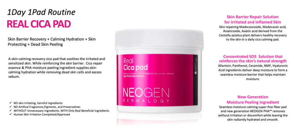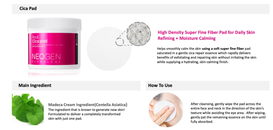 Soaked in centella extract and hyaluronic acid, these peeling pads soothe and tone irritated skin while gently removing dead skin cells. With a skin-compatible pH of 5.83, the pads are suitable for daily use to reduce redness and boost collagen production. Use the cotton side to remove dead skin cells and the embossed side to pat in essence.