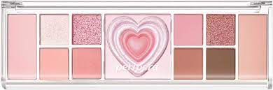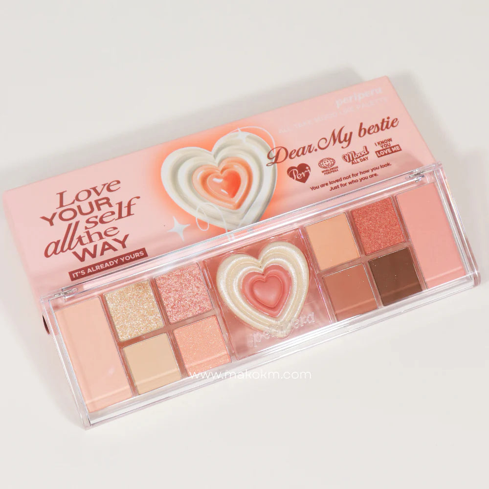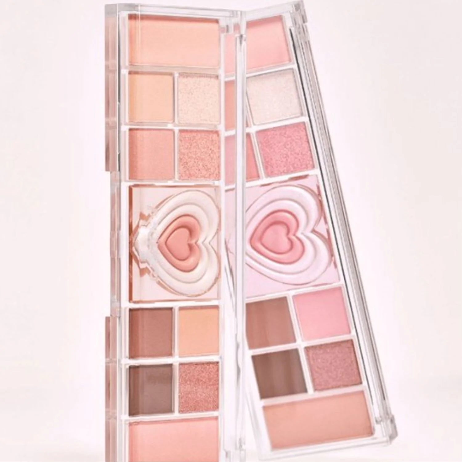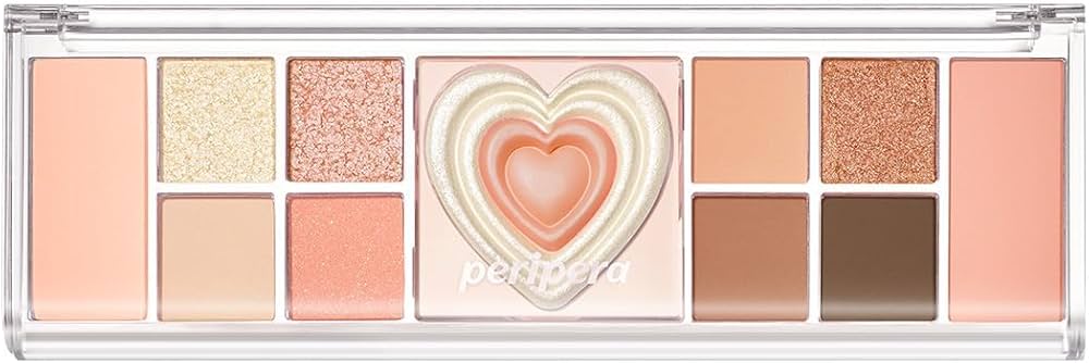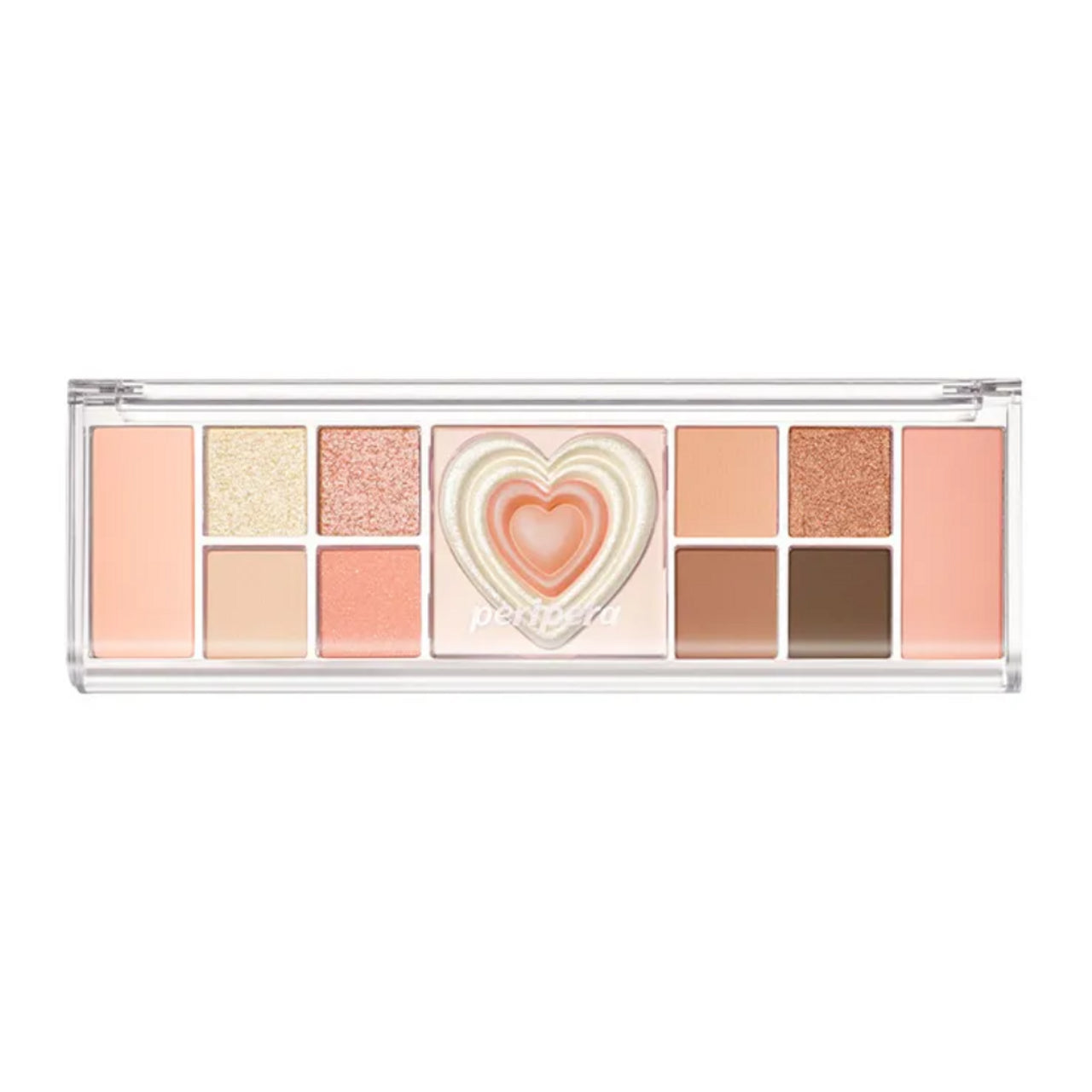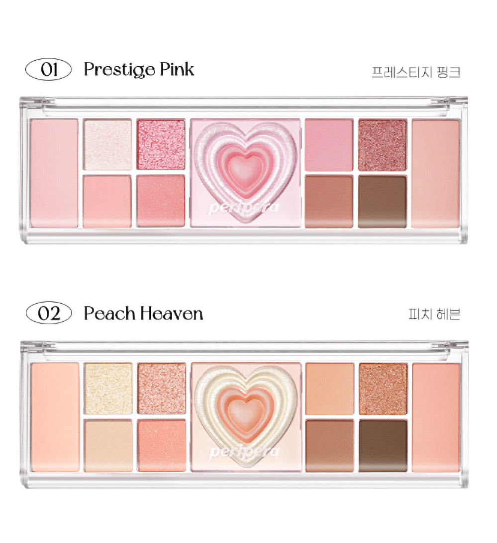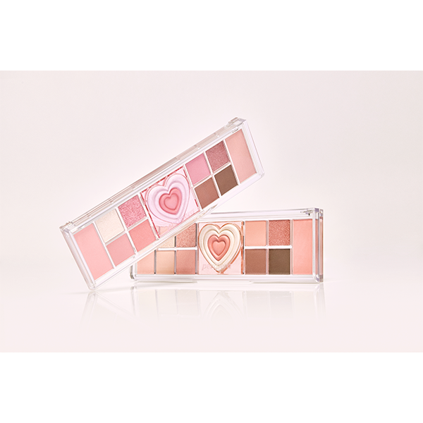 Part of peripera’s Peritage Collection, this soft glam take on the brand’s iconic All Take Mood Like Palette offers colors in matte, shimmery and glittery formulations functioning as eye shadow, blush and highlighter. The palette is centered by a heart-shaped pan featuring multiple shades. This product comes in two dreamy color combinations, including #01 Prestige Pink (pinks and browns) and #02 Peach Heaven (beige and bronze colors).