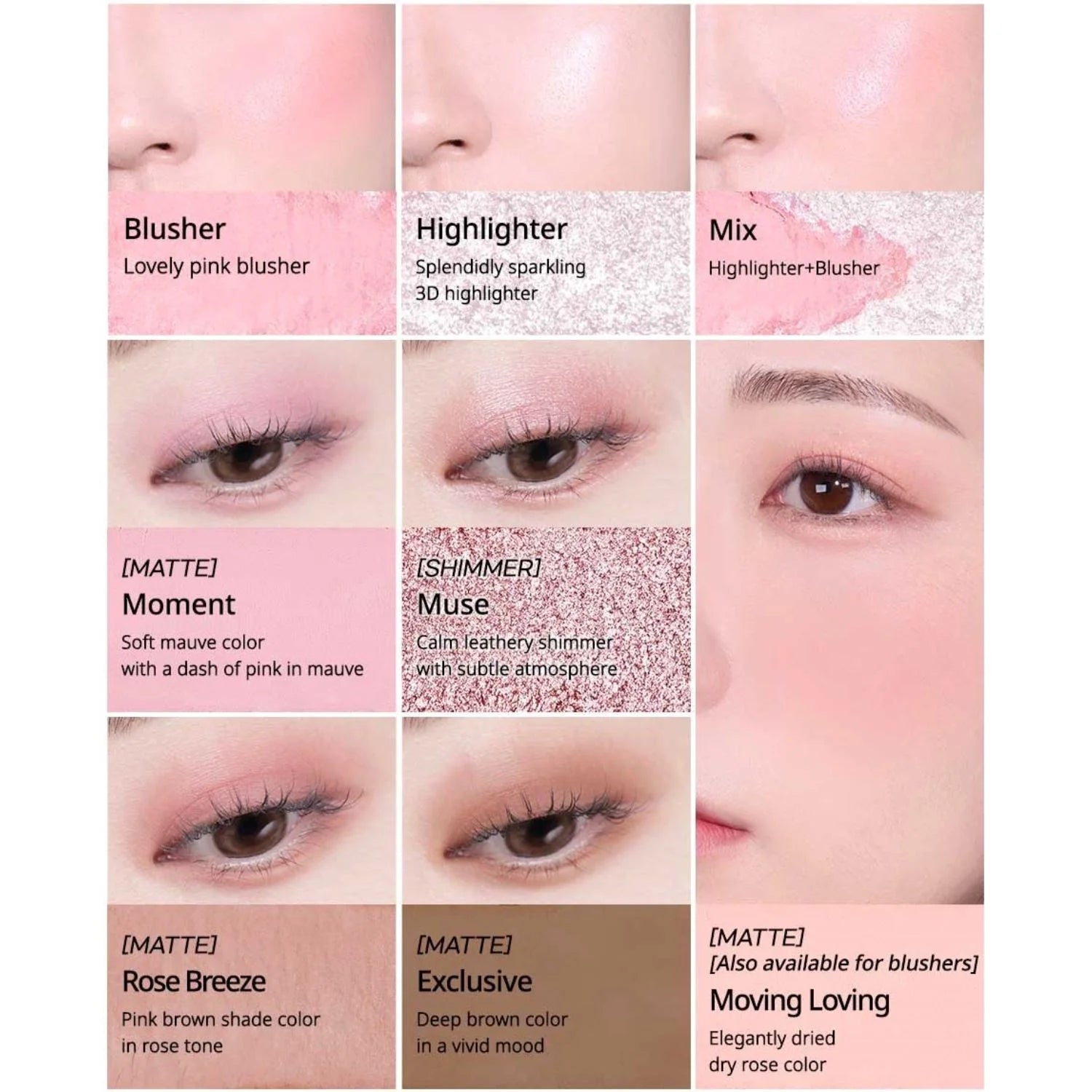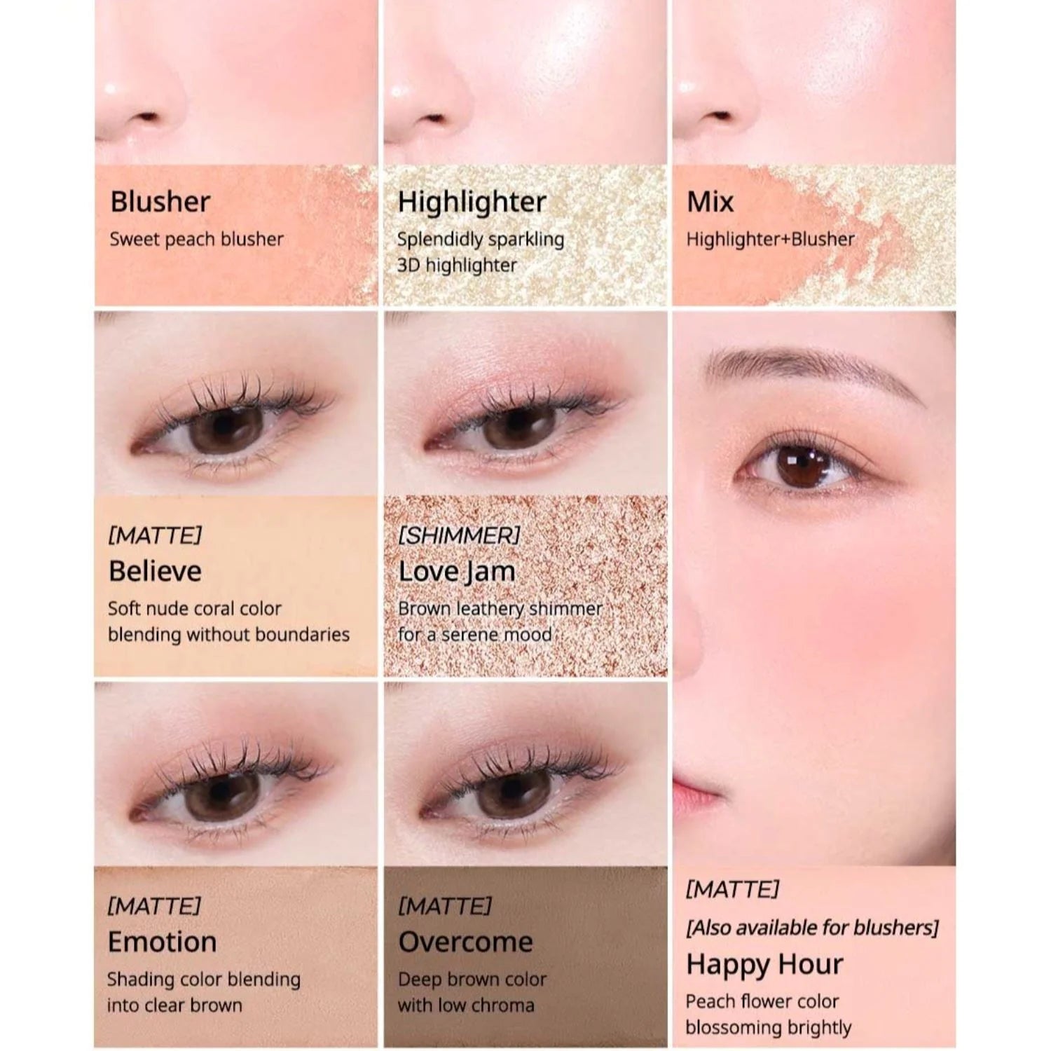 Water, CAPRYLIC/CAPRIC TRIGLYCERIDE, [Lonesome Heart]: Mica, Cellulose, CI 77891(TITANIUM DIOXIDE), Cetearyl Alcohol [Hey Brown]: Mica, Polyglyceryl-2 Triisostearate, Cetearyl Alcohol [Bursting Heart]: Calcium Aluminum Borosilicate, Dimethicone/vinyl Dimethicone Crosspolymer, 2-HEXANEDIOL, CETEARYL ALCOHOL, Ethylhexyl Palmitate, Vinyl Dimethicone/Methicone Silsesquioxane Crosspolymer, Synthetic Fluorphlogopite, DIISOSTEARYL MALATE, Polyethylene Terephthalate, Hydrogenated Castor Oil Isostearate, Glyceryl Caprylate, TRIETHOXYCAPRYLYLSILANE, 1, Aluminum [Blazing Breeze]: Mica, [Fog Beige]: Mica, [Basic Start]: Talc, SILICA, Mica, Lauroyl Lysine, Trimethylsiloxysilicate, Cetearyl Alcohol [Dipping The Brown]: Mica, Aluminum Hydroxide, Acrylates/Stearyl Acrylate/Dimethicone Methacrylate Copolymer, Carmine, Cetearyl Alcohol [Flat Side]: Mica, C20-24 Alkyl Dimethicone, Phenoxyethanol, Triethoxycaprylylsilane [In Your Pink]: Mica, CI 77492 (IRON OXIDES), Cetearyl Alcohol [Fantasy Gleaming]: Mica, AQUA (WATER), Polyvinyl Butyral, Caprylic/capric Triglyceride, Ethylene/VA Copolymer, Cetearyl Alcohol [Feeling Myself]: Mica, Ultramarines, Cetearyl Alcohol [Sunday Sounds]: Mica, Tin Oxide, Polybutylene Terephthalate, Titanium Dioxide, 1,2-Hexanediol, Cetearyl Alcohol [Already Bloom]: Mica, Carmine [Chilling Out Day]: Calcium Aluminum Borosilicate, Cetearyl Alcohol [Cocoa Tea]: Mica, Benzoic Acid [Sparkle Fantasy]: Polybutylene Terephthalate, TALC, Cetearyl Alcohol [Blushed Frame]: Mica, Isononyl Isononanoate, Phenyl Methicone, Hydrogenated Polyisobutene, Aluminum [Hurry Cherry Up]: Talc, Silica, Iron Oxide Black, CI 77007 (ULTRAMARINES), Acrylates Copolymer, Glyceryl Caprylate [Purplish Dark]: Mica, Cetearyl Alcohol [Illusion Mood]: Mica, Phytosteryl/Isostearyl/Cetyl/Stearyl/Behenyl Dimer Dilinoleate, Styrene/acrylates Copolymer, Tartrazine, Iron Oxide Yellow, Cetearyl Alcohol [Autumn De Road]: Talc, CI 77499 (IRON OXIDES), Cetearyl Alcohol [Glint Brown]: Calcium Aluminum Borosilicate, Cetearyl Ethylhexanoate, ZINC STEARATE, Isostearyl Neopentanoate, Carmine [Waiting 2:30]: Mica, Calcium Sodium Borosilicate, Polyvinyl Alcohol, Cetearyl Alcohol [Move Like Me]: Mica, Phenyl Trimethicone, Cetearyl Alcohol [Just Stunning]: Synthetic Fluorphlogopite, Triethoxycaprylylsilane, CI 77491 (IRON OXIDES), Diphenylsiloxy Phenyl Trimethicone, Cetearyl Alcohol [Cherry Bubble Fizz]: Polybutylene Terephthalate, ALUMINUM STARCH OCTENYLSUCCINATE, Aluminum Starch Octenylsuccinate, Cetearyl Alcohol [Dazzinling Bubble]: Polybutylene Terephthalate, Purified Water, Hydrogenated Castor Oil Dimer Dilinoleate, Octyldodecanol, Palmitic Acid, Cetearyl Alcohol [Magenta Edge]: Calcium Aluminum Borosilicate, MICA, Cetearyl Alcohol [Holo-Lighting]: Calcium Aluminum Borosilicate, Cetearyl Alcohol [Apricot Shower]: Mica, Cetearyl Alcohol [Glitzy Closure]: Calcium Aluminum Borosilicate, Dimethicone, Talc, Cetearyl Alcohol [Flashed Click]: Polyethylene Terephthalate, Triethoxycaprylylsilane [Exclusive Ash]: Mica, CI 77891 (Titanium Dioxide), Cetearyl Alcohol [Nudie Endingcut]: Titanium Dioxide, GLYCERYL CAPRYLATE, Iron Oxide Red, Cetearyl Alcohol [Brown Moment]: Mica, Calcium Aluminum Borosilicate, Polybutene, DIMETHICONE, Zinc Stearate, Cetearyl Alcohol, Diisostearyl Malate, Cetearyl Alcohol [Dandelion Crumble]: Calcium Aluminum Borosilicate.