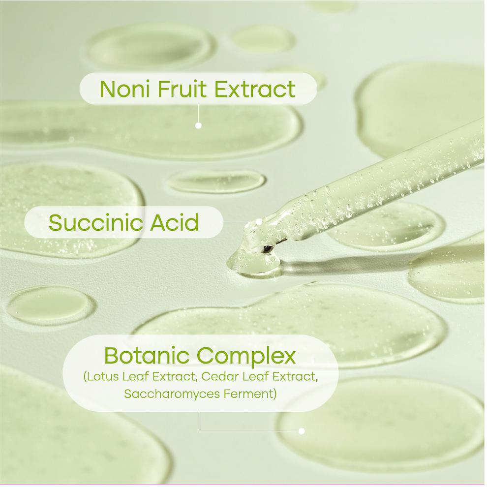Water (Solvents), Butylene Glycol(Skin-Conditioning Agents), Pentylene Glycol (Skin-Conditioning Agents), Dipropylene Glycol (Skin-Conditioning Agents), Propanediol (Solvents), Morinda Citrifolia Fruit Extract(Skin-Conditioning Agents), Succinic Acid(pH Adjusters), Cryptomeria Japonica Leaf Extract (Skin-Conditioning Agents), Panthenol(Skin-Conditioning Agents), Coptis Chinensis Root Extract(Skin-Conditioning Agents), Nelumbo Nucifera Leaf Extract (Skin-Conditioning Agents), Saccharomyces Ferment(Skin-Conditioning Agents), Glycerin (Humectants), Betaine (Humectants), Caprylyl Glycol(Skin-Conditioning Agents), Acrylates/C10-30 Alkyl Acrylate Crosspolymer (Viscosity Increasing Agents), Arginine(pH Adjusters), Hydroxyacetophenone(Antioxidant), Cetearyl Olivate (Surfactants), Dipotassium Glycyrrhizate(Skin-Conditioning Agents), Allantoin (Skin Protectant), 1,2-Hexanediol (Solvents), Sorbitan Olivate(Surfactants), Malachite Extract(Skin-Conditioning Agents), Ethylhexylglycerin (Skin-Conditioning Agents), Xanthan Gum(Viscosity Increasing Agents), Disodium EDTA(Chelating Agents), Citric Acid (pH Adjusters), Gluconic Acid (Skin-Conditioning Agents).