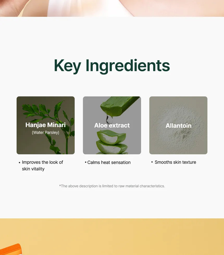 - Hanjae Minari (Water Parsley) improves the look of skin vitality, Aloe Extract calms heat sensation, and Allantoin smooths skin texture.