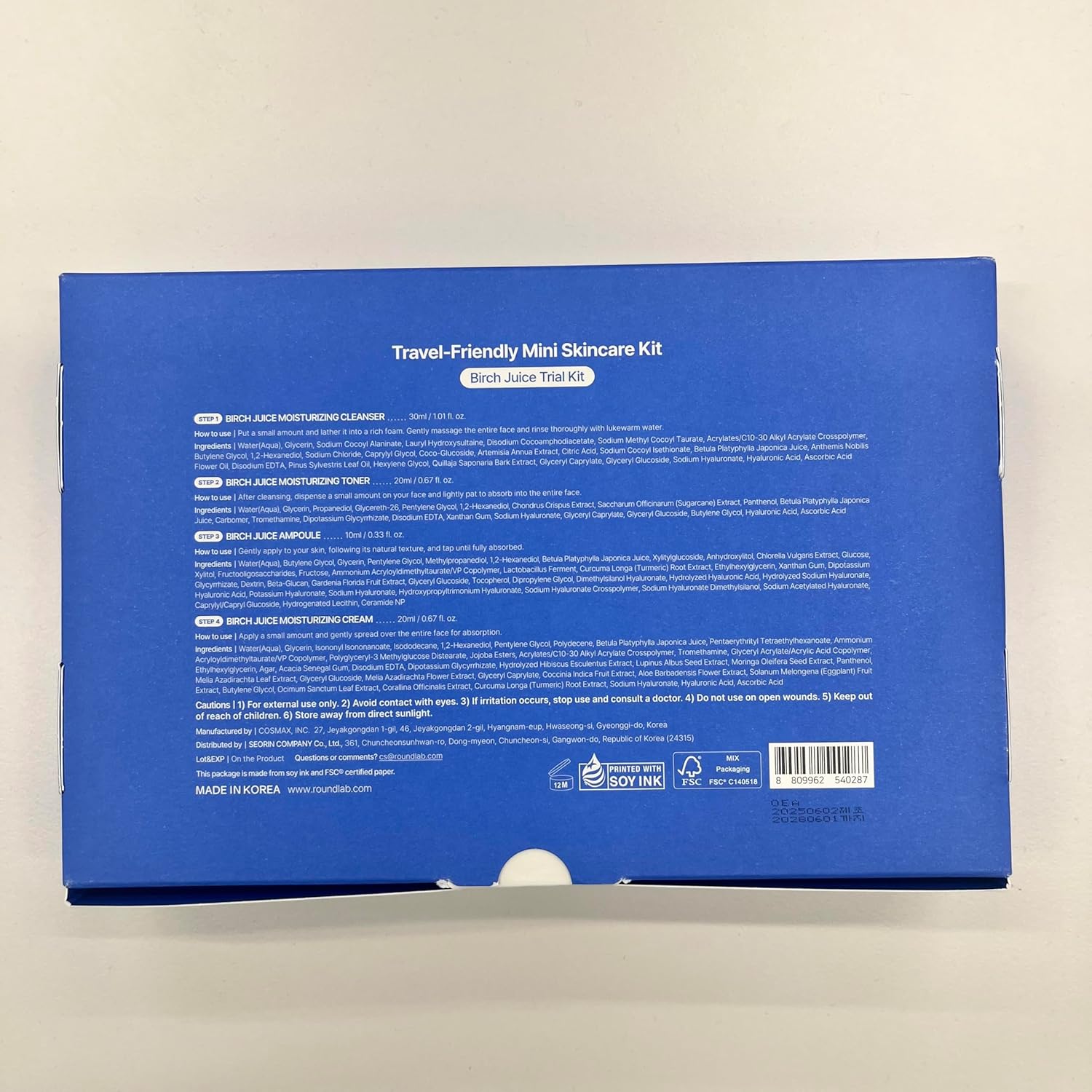 [Cleanser] Water, Glycerin, Sodium Cocoyl Alaninate, Lauryl Hydroxysultaine, Disodium Cocoamphodiacetate, Sodium Methyl Cocoyl Taurate, Acrylates/C10-30 Alkyl Acrylate Crosspolymer, Butylene Glycol, 1,2-Hexanediol, Sodium Chloride, Caprylyl Glycol, Coco-Glucoside, Artemisia Annua Extract, Citric Acid, Sodium Cocoyl Isethionate, Betula Platyphylla Japonica Juice, Anthemis Nobilis Flower Oil, Disodium EDTA, Pinus Sylvestris Leaf Oil, Hexylene Glycol,Quillaja Saponaria Bark Extract, Glyceryl Caprylate, Glyceryl Glucoside, Sodium Hyaluronate, Hyaluronic Acid, Ascorbic Acid [Toner] Water, Glycerin, Propanediol, Glycereth-26, Pentylene Glycol, 1,2-Hexanediol, Chondrus Crispus Extract, Saccharum Officinarum (Sugarcane) Extract, Panthenol, Betula Platyphylla Japonica Juice, Carbomer, Tromethamine, Dipotassium Glycyrrhizate, Disodium EDTA, Xanthan Gum, Sodium Hyaluronate, Glyceryl Caprylate, Glyceryl Glucoside, Butylene Glycol, Hyaluronic Acid, Ascorbic Acid [Cream] Water, Glycerin, Isononyl Isononanoate, Isododecane, 1,2-Hexanediol, Pentylene Glycol, Polydecene, Betula Platyphylla Japonica Juice, Pentaerythrityl Tetraethylhexanoate, Ammonium Acryloyldimethyltaurate/VP Copolymer, Polyglyceryl-3 Methylglucose Distearate, Jojoba Esters, Acrylates/C10-30 Alkyl Acrylate Crosspolymer, Tromethamine, Glyceryl Acrylate/Acrylic Acid Copolymer, Glyceryl Caprylate, Ethylhexylglycerin, Agar, Acacia Senegal Gum, Disodium EDTA, Dipotassium Glycyrrhizate, Hydrolyzed Hibiscus Esculentus Extract, Lupinus Albus Seed Extract, Moringa Oleifera Seed Extract, Panthenol, Melia Azadirachta Leaf Extract, Glyceryl Glucoside, Melia Azadirachta Flower Extract, Coccinia Indica Fruit Extract, Aloe Barbadensis Flower Extract, Solanum Melongena (Eggplant) Fruit Extract, Butylene Glycol, Ocimum Sanctum Leaf Extract, Corallina Officinalis Extract, Curcuma Longa (Turmeric) Root Extract, Sodium Hyaluronate, Hyaluronic Acid, Ascorbic Acid [Ampoule] Water, Butylene Glycol, Glycerin, Pentylene Glycol, Methylpropanediol, 1,2-Hexanediol, Betula Platyphylla Japonica Juice, Xylitylglucoside, Anhydroxylitol, Chlorella Vulgaris Extract, Glucose, Xylitol, Fructooligosaccharides, Fructose, Ammonium Acryloyldimethyltaurate/VP Copolymer, Lactobacillus Ferment, Curcuma Longa (Turmeric) Root Extract, Ethylhexylglycerin, Xanthan Gum, Dipotassium Glycyrrhizate, Dextrin, Beta-Glucan, Gardenia Florida Fruit Extract, Glyceryl Glucoside, Tocopherol, Dipropylene Glycol, Dimethylsilanol Hyaluronate, Hydrolyzed Hyaluronic Acid, Hydrolyzed Sodium Hyaluronate, Hyaluronic Acid, Potassium Hyaluronate, Sodium Hyaluronate, Hydroxypropyltrimonium Hyaluronate, Sodium Hyaluronate Crosspolymer, Sodium Hyaluronate Dimethylsilanol, Sodium Acetylated Hyaluronate, Caprylyl/Capryl Glucoside, Hydrogenated Lecithin, Ceramide NP