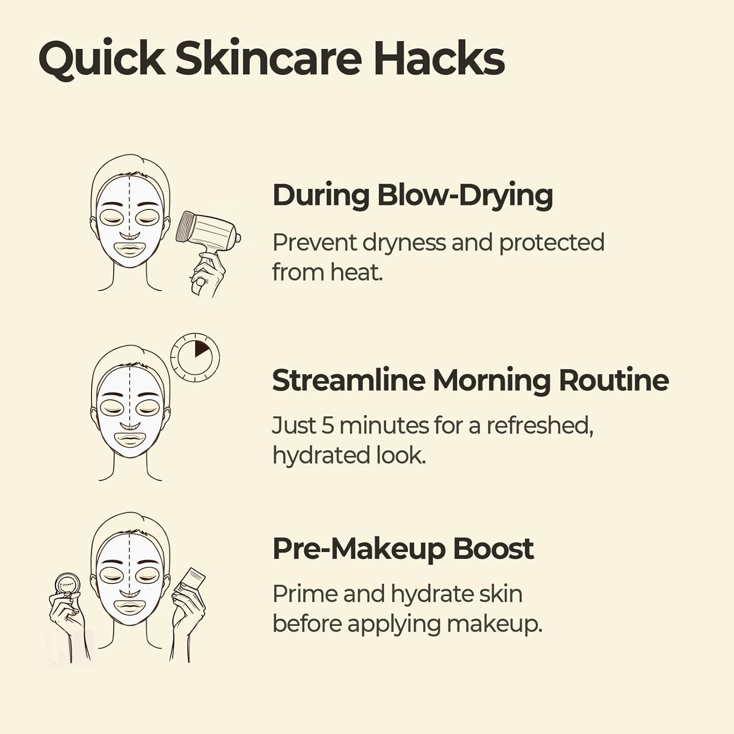 Tip. On busy mornings or before makeup, just pull out one sheet of mask and take care of your skin quickly and easily.