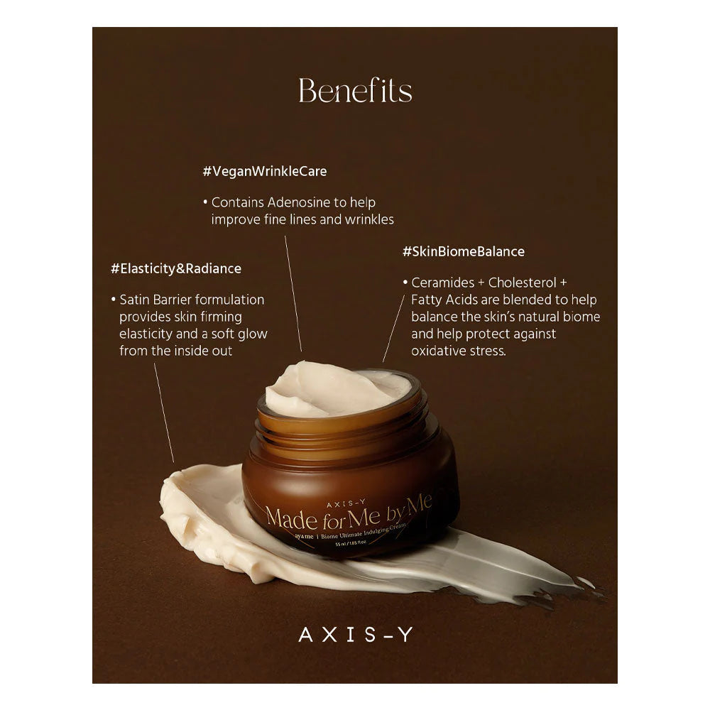 A luxurious cream with a Satin Barrier formulation which creates a thin moisture barrier on the skin, improving skin texture and providing a soft glow from the inside out. In addition to AXIS-Y’s unique Special Biome Blend, the cream features skin lipid components ‘Ceramides + Cholesterol + Fatty Acids’ to help improve skin elasticity.
